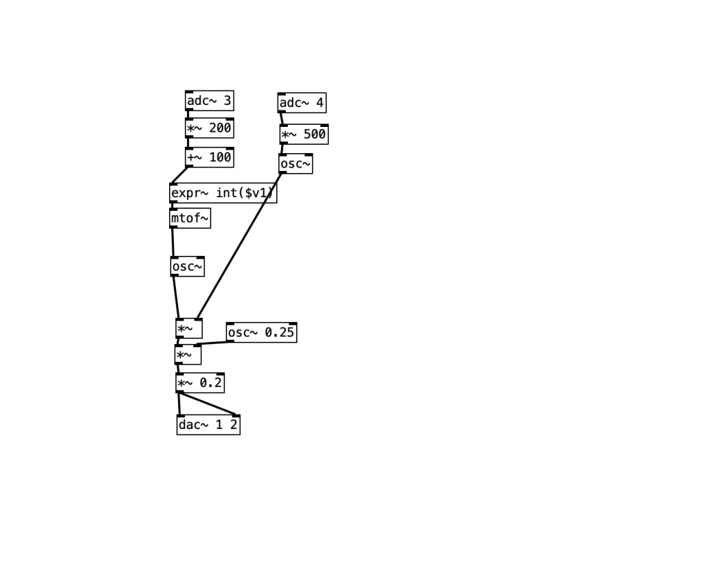 In the patch there is a signal generator at the top that is producing a sine tone (the carrier), this tone’s frequency is controlled by the first analog input, which in this case is the pressure sensor. As the pressure applied changes, the sensor outputs varying voltage levels that are allocated to different frequency values, allowing the pitch of the tone to fluctuate in response to how much force is applied. The carrier’s amplitude is modulated by another signal (the modulator), which is controlled by the potentiometer, the frequency of this signal can be adjusted to modulate at slower and higher rates, creating a rather beautiful tremolo effect.