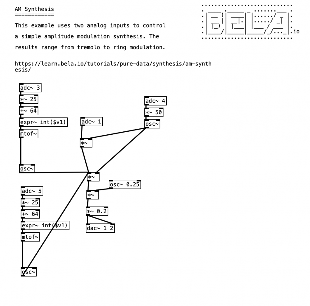 Although this was not my first time learning about AM synthesis, this process has played a major part in my understanding of it, purely because of having this sequential, visual representation of the process. I am making each change consciously and am able to both see and hear how the sound is being controlled through my own choices and manipulation. This is one thing I have noticed about Pure data, and the tasks I have complete so far, it has really expanded my knowledge and understanding on concepts I have been slightly aware of before. Regardless of the level of prior knowledge, it has deepened my perception on this more kind of technical work, simply through stripping it back to basics and building it up, seeing how each small change effects the final product.