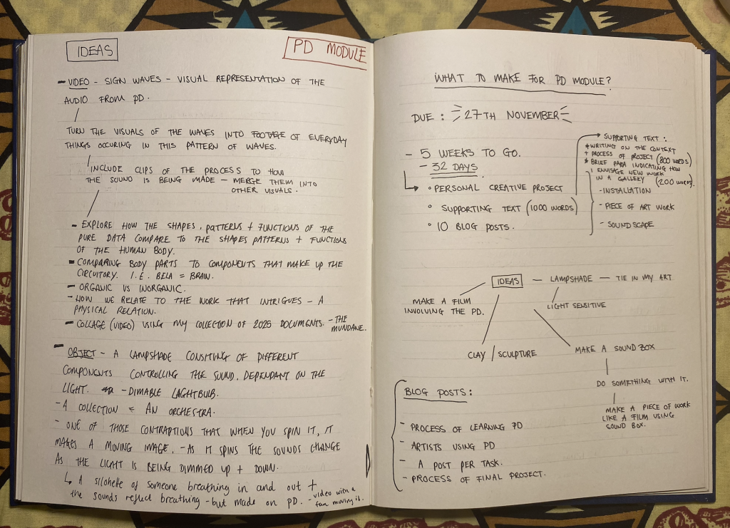 Going into this module assignment I knew I wanted to combine my knowledge and skills within sound work with my interest in mixed media to create a piece of work that is drastically different in regards to my previous works involving sound and music. I feel since starting my second year I have really involved myself in this module, majorly enjoying learning an entirely new medium that has changed my perception on my own practice. Throughout the last year I have felt quite lost within my work, questioning whether or not this approach to sonic art is even right for me, this has been due to not really being able to define my practice, which I still can’t really do. However, since being able to refine my skills within this module, learning a new form of sonic work that not only involves technical work on the computer, but also practical work with my hands, I feel much more confident in my own abilities and my choice to study this course. Although I am unsure where I want to go with this in the future, I currently feel very inspired in working with Pd and circuitry, and as of now thats what is important to me, -feeling inspired in the moment and enthusiastic to progress in my learning.