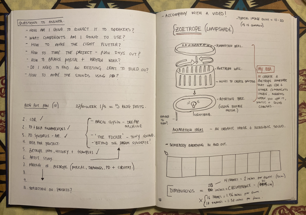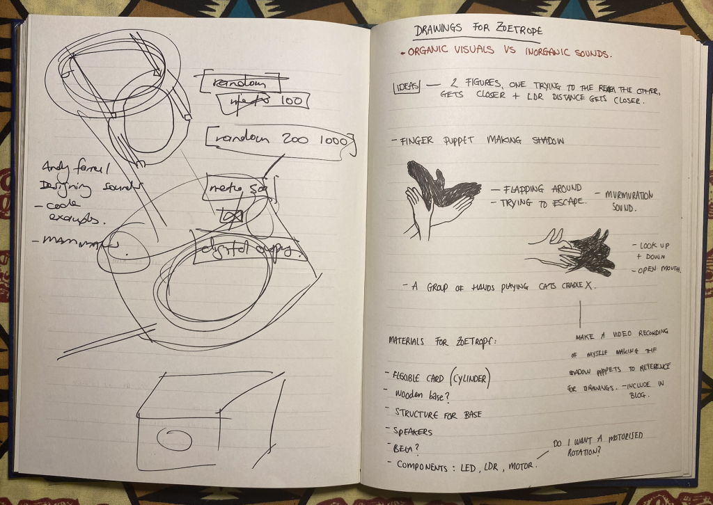 As mentioned in the pages above my idea for incorporating the Pd and circuitry work involves seeing the zoetrope structure as a lampshade like object, placing a light bulb (most likely an LED) into the middle of the cylinders. The reason for this is, I will then place LDRs around the base structure of the zoetrope, surrounding the lightbulb which will be connected into the Bela board running into Pd where I will have some kind of soundscape being produced. I am planning to code the LED to flash at a certain pace to match the rotation speed of the zoetrope, this flashing will then trigger the LDRs to create this fluttering effect which will modulate the original soundscape. I am currently unsure on how I want the zoetrope to rotate, I ideally, would like the Bela to power a motor which moves the cylinders round at an even, steady pace, however I need to research into whether that will be possible in the time frame I have until the hand in.